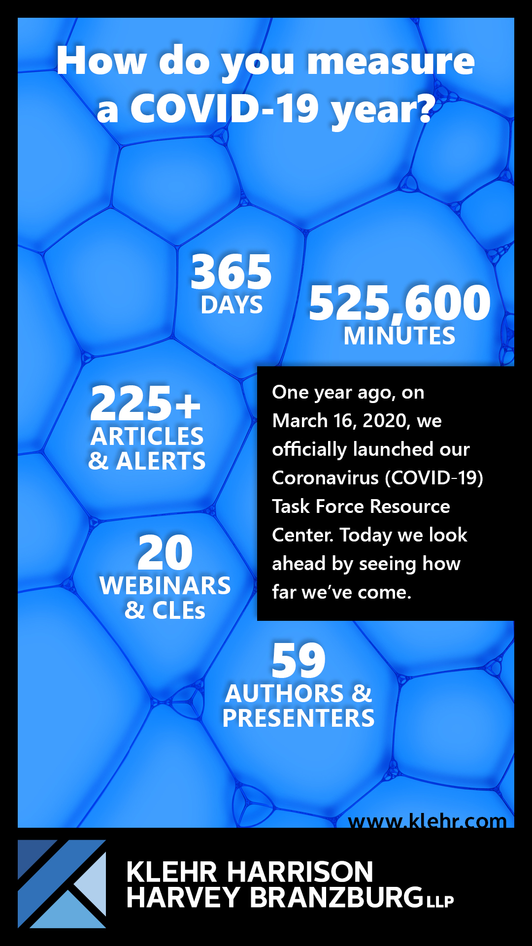 A full year has passed since we first announced the formation of our Coronavirus (COVID-19) Task Force Resource Center. Through all the twists and turns, we have stood ready to assist you in your business and legal needs. While recent news indicates that a return to normalcy and an end could be in sight, we will continue to provide important information and timely guidance as the COVID-19 situation develops.